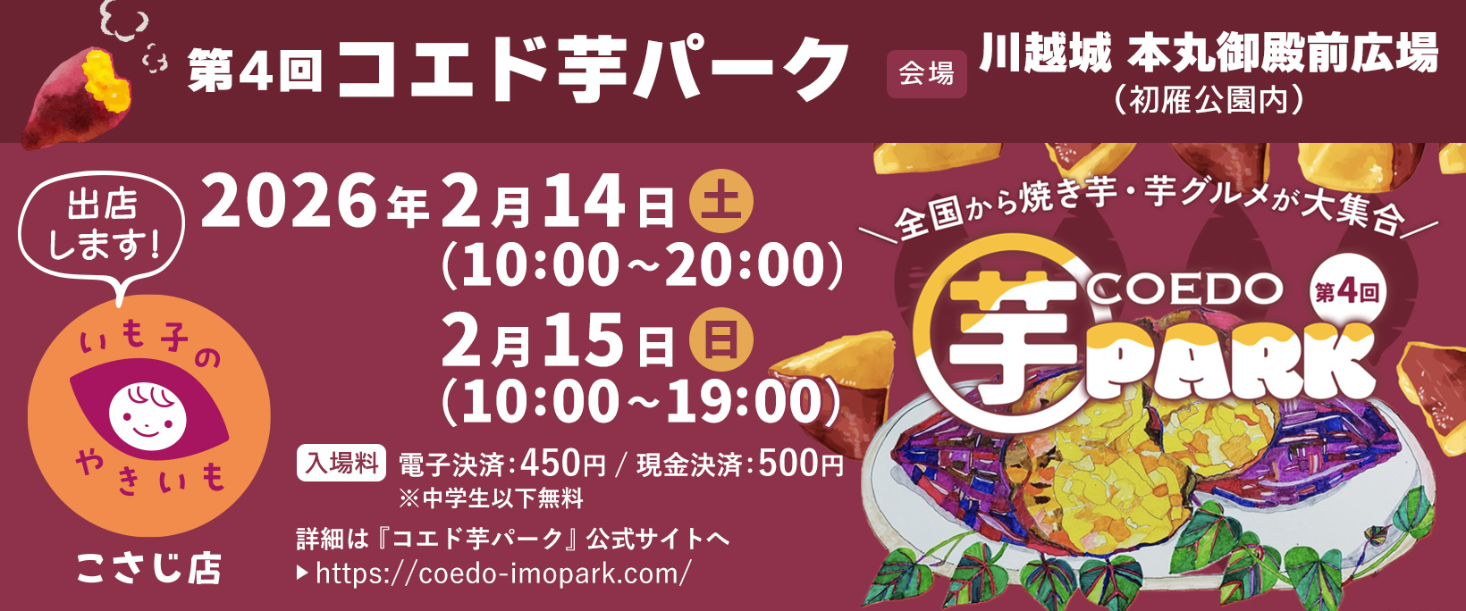 2026年2月14日(土)・15日(日)の2日間、川越城 本丸御殿前広場(初雁公園内)にて『コエド芋パーク』が開催されます。