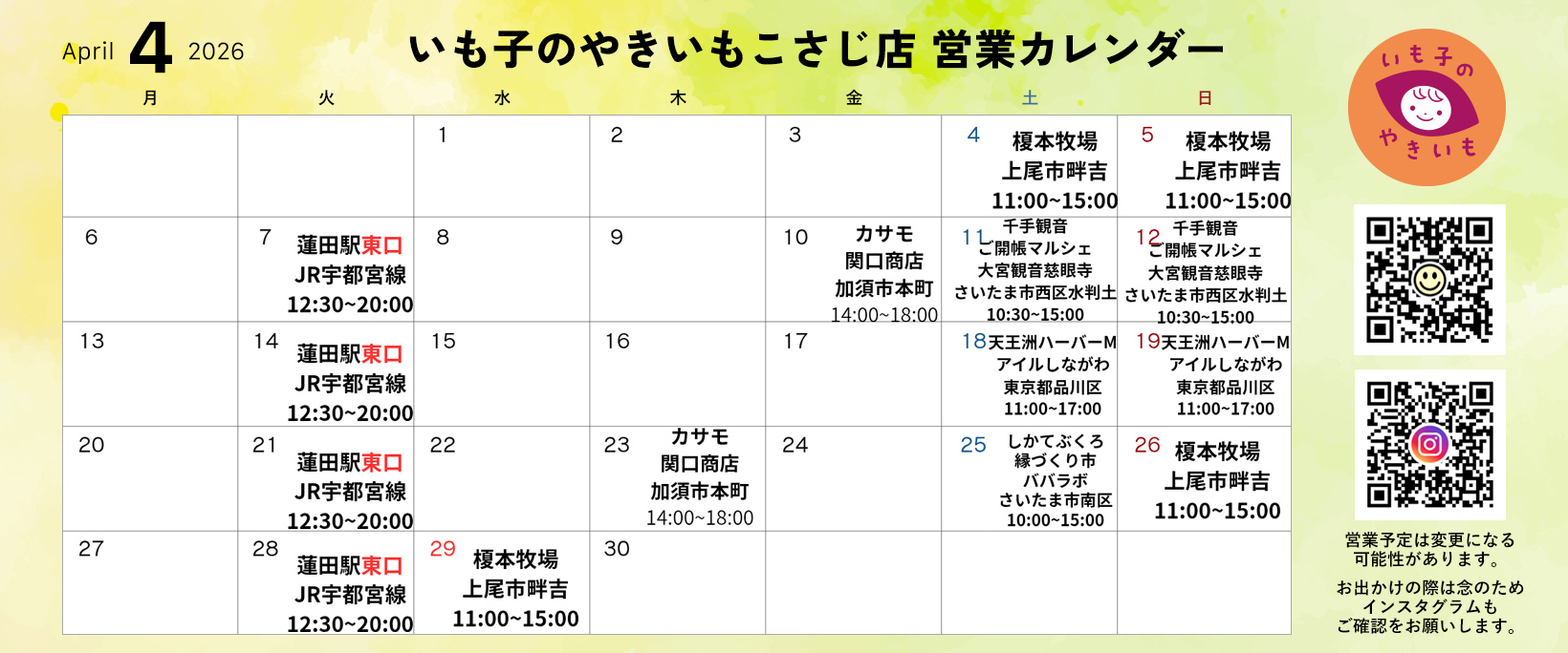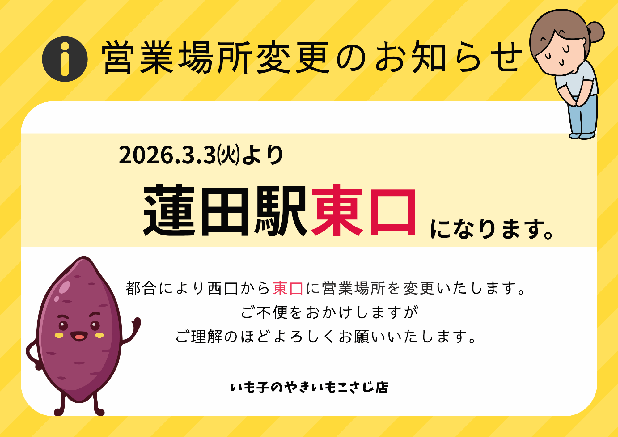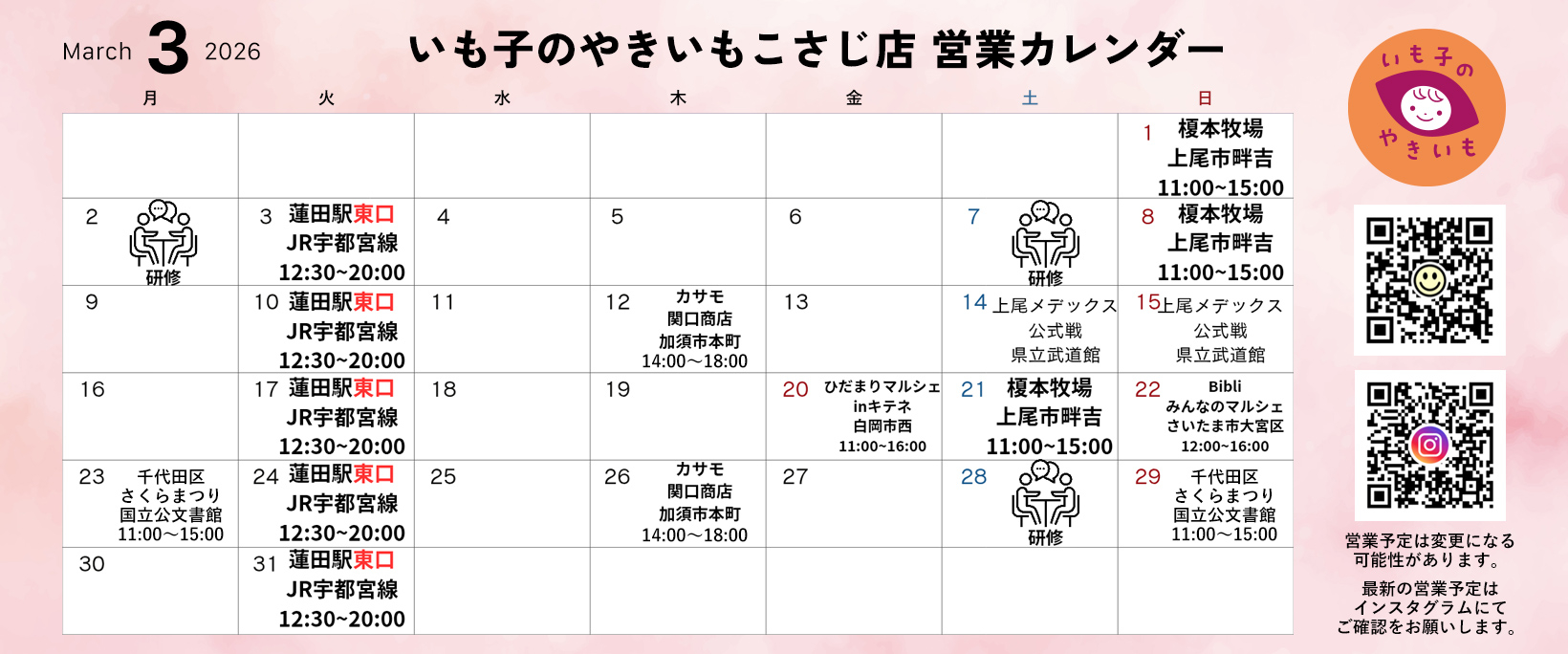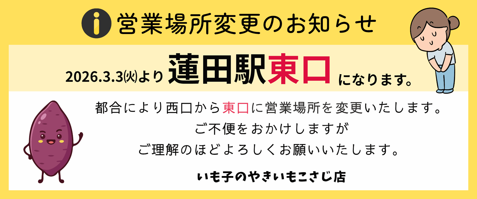 2026年3月3日(火)より、毎週火曜日の営業場所が蓮田駅西口から東口へ変更となります。