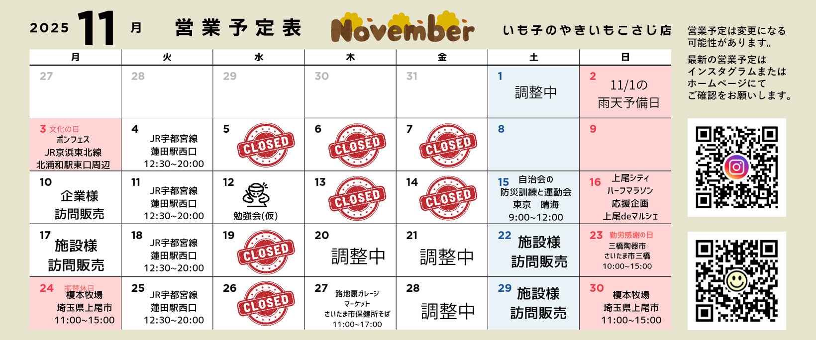 営業カレンダー(2025年11月分)を更新しました。