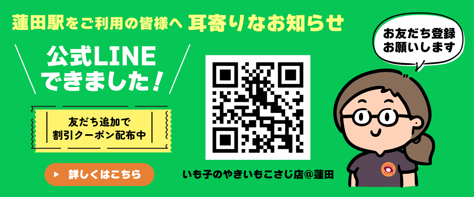 蓮田駅での販売情報を中心に、こさじ店の最新情報をお届けするLINE公式アカウント『いも子のやきいもこさじ店@蓮田』を開設致しました!